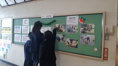 12月に入り、一校舎の玄関掲示板には、4年生の作品などが飾られています。朝支度を終えた係の子どもたちが飾っていました。今回は国語の作品とオリジナルのクリスマスの飾り、そして図画工作科の紹介写真です。 一つ一つのクリスマス飾りが素敵です。ご来…