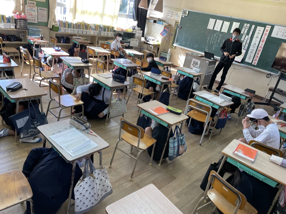 【いつも教室というわけではありません。揺れがおさまるまで頭を守る行動をとります】
