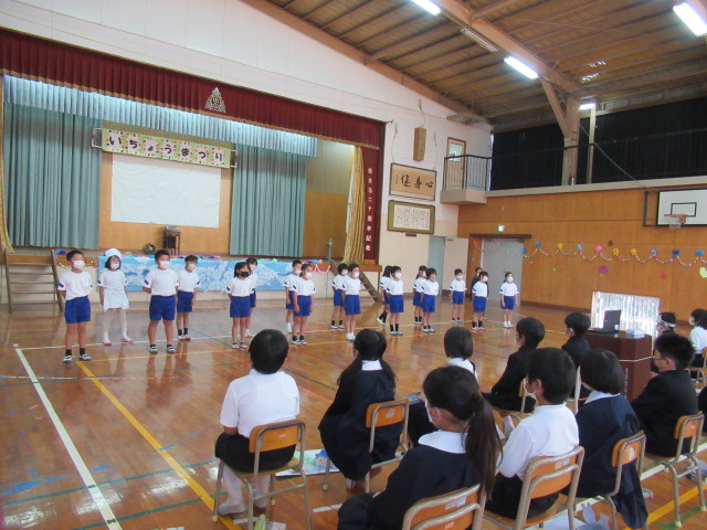 田村洋先生に作っていただいた出合の愛唱歌「出合の仲間たち」を1・2年生が元気よく歌い、踊りました。