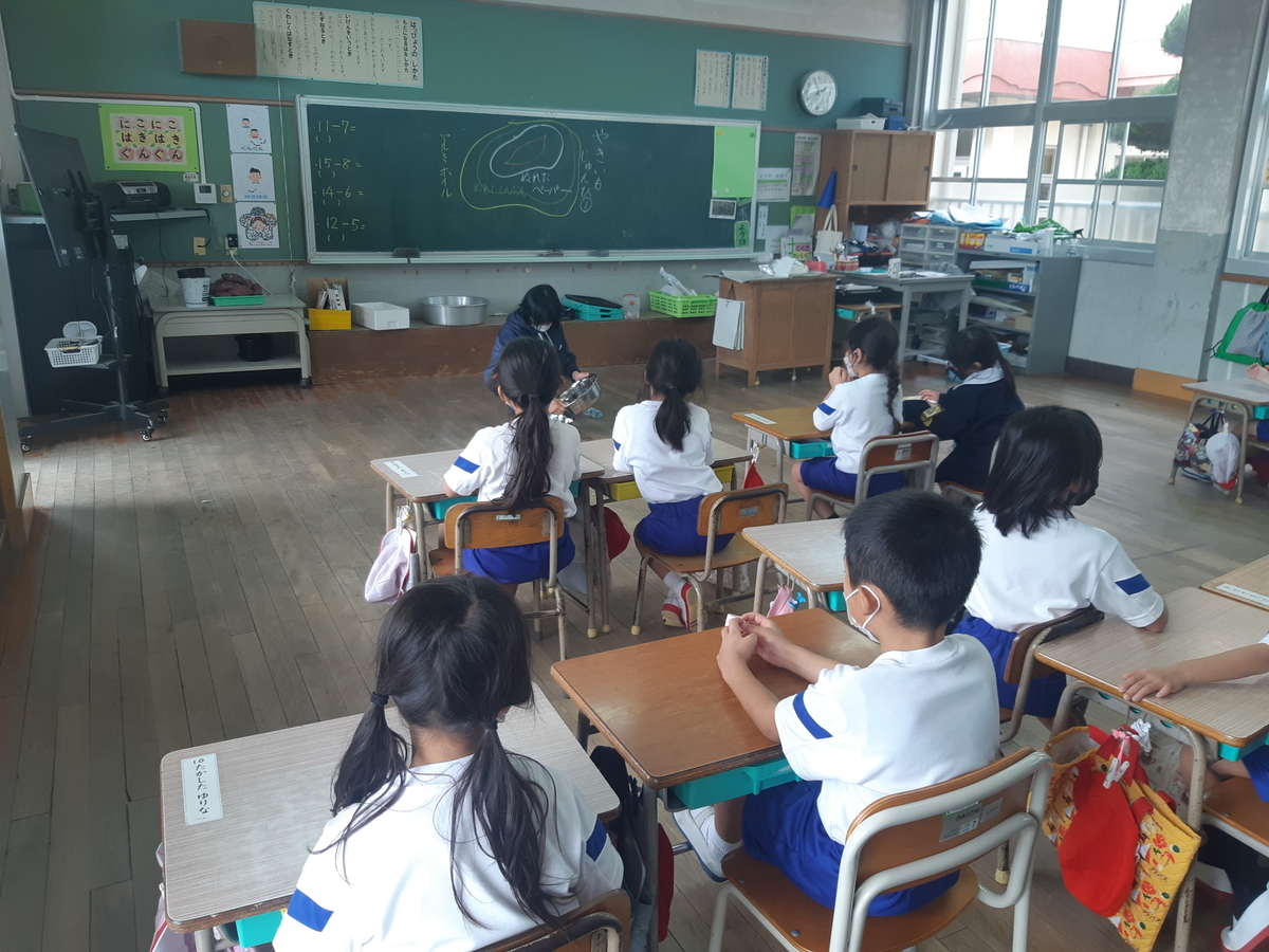 愛情をたっぷりに育てたサツマイモを使っての焼き芋ということで、1年生は、明日の焼き芋大会を楽しみにしています。今日は前日準備として、サツマイモの一部をアルミホイルでくるむ作業を行いました。